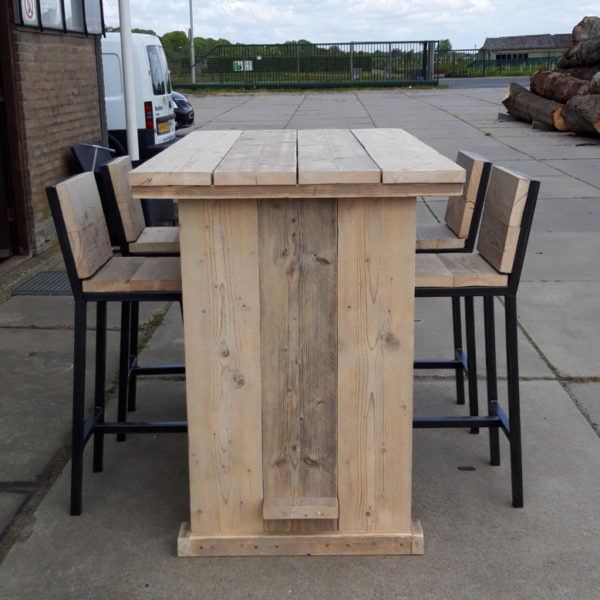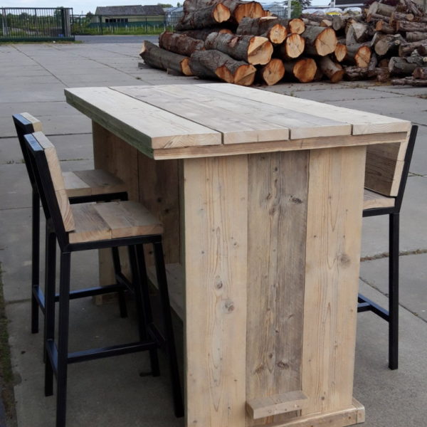 Bar table of used scaffolding wood 160x88x120cm (WxDxH). We can also provide the bar stools on the photo of (untreated) steel and scaffolding wood; price at request.