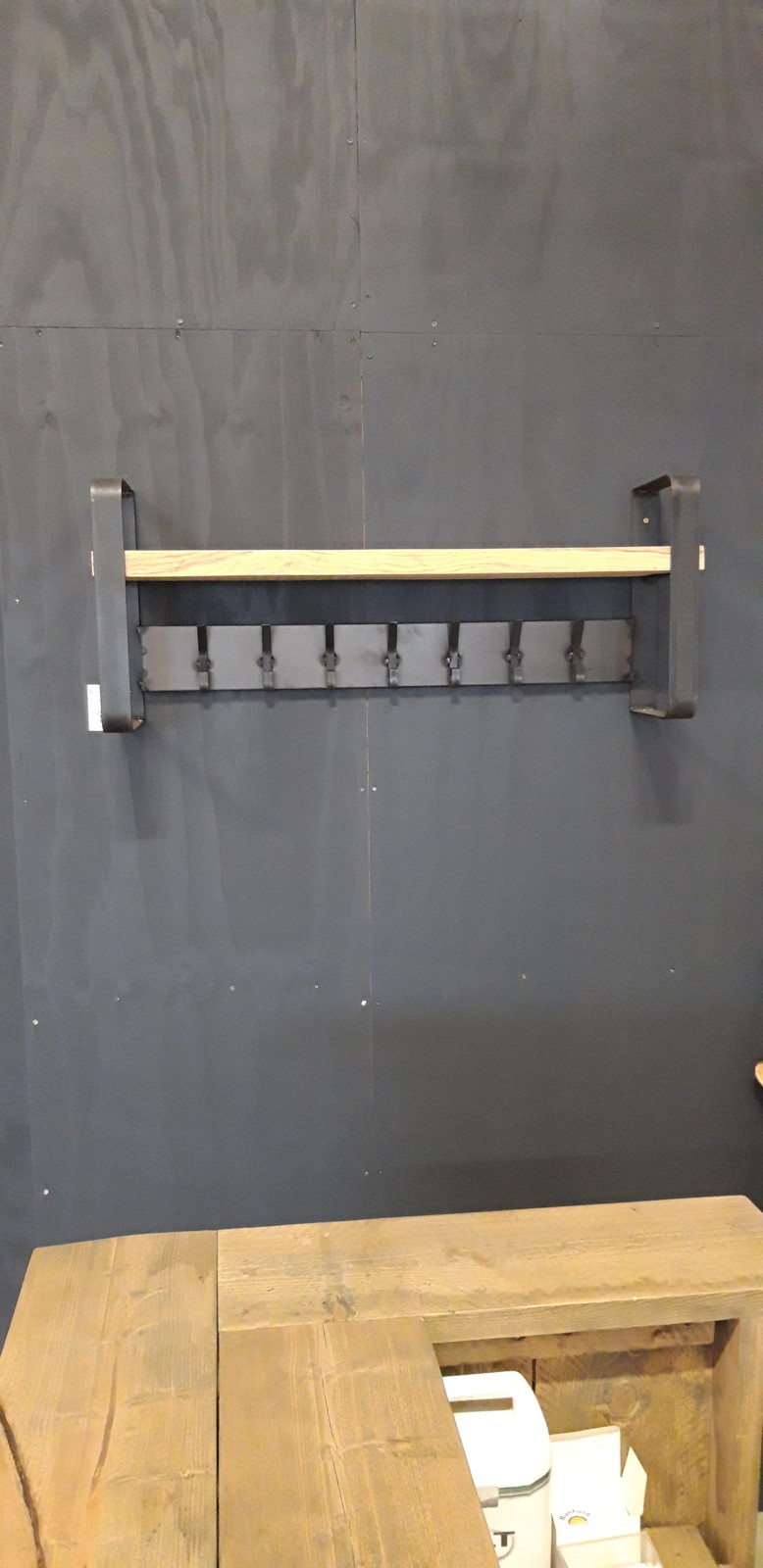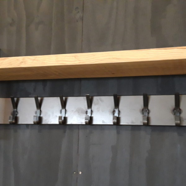Steel coat rack with thick oak wooden shelf. 60 cm wide, 25cm deep and 40cm high.