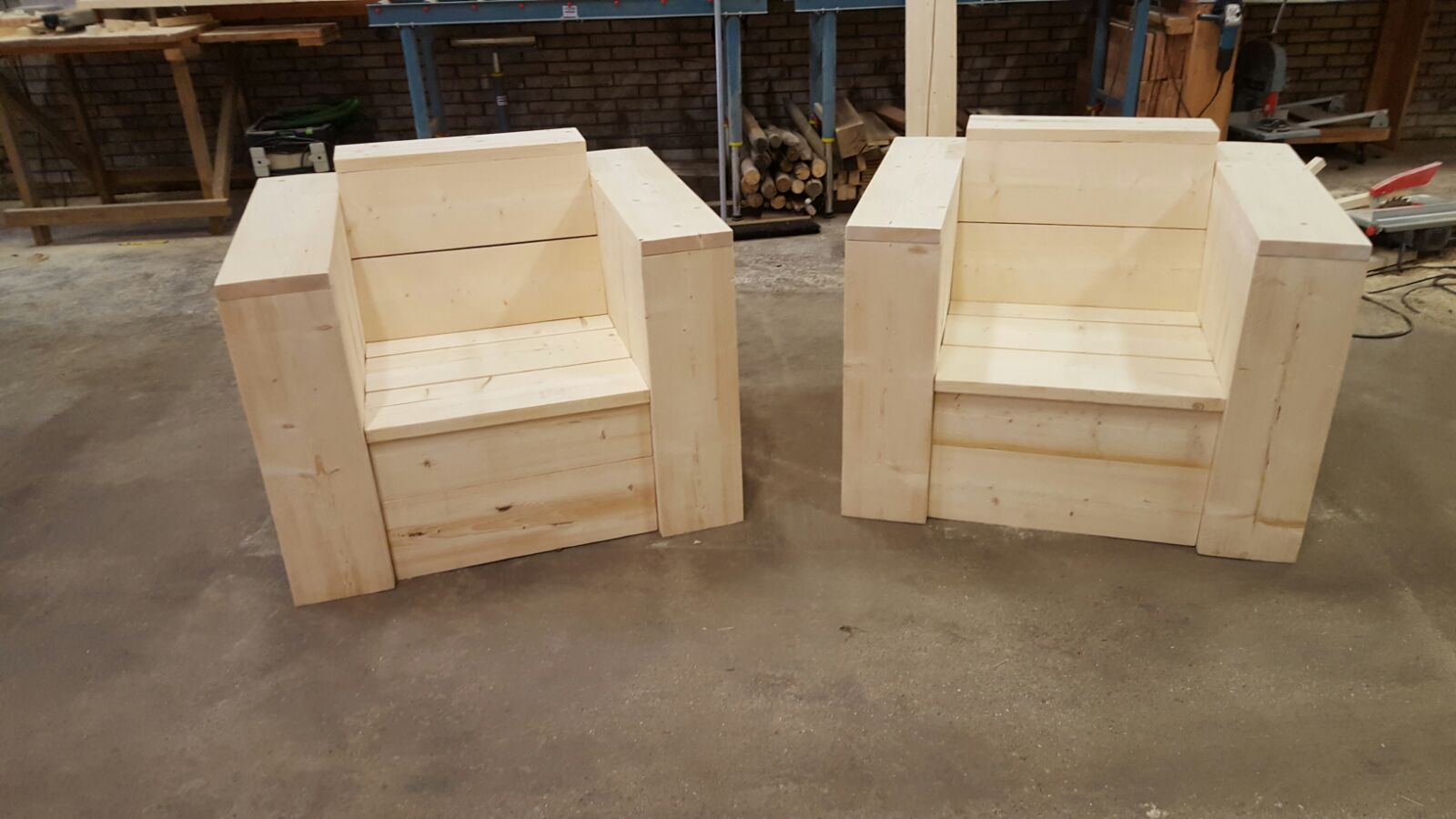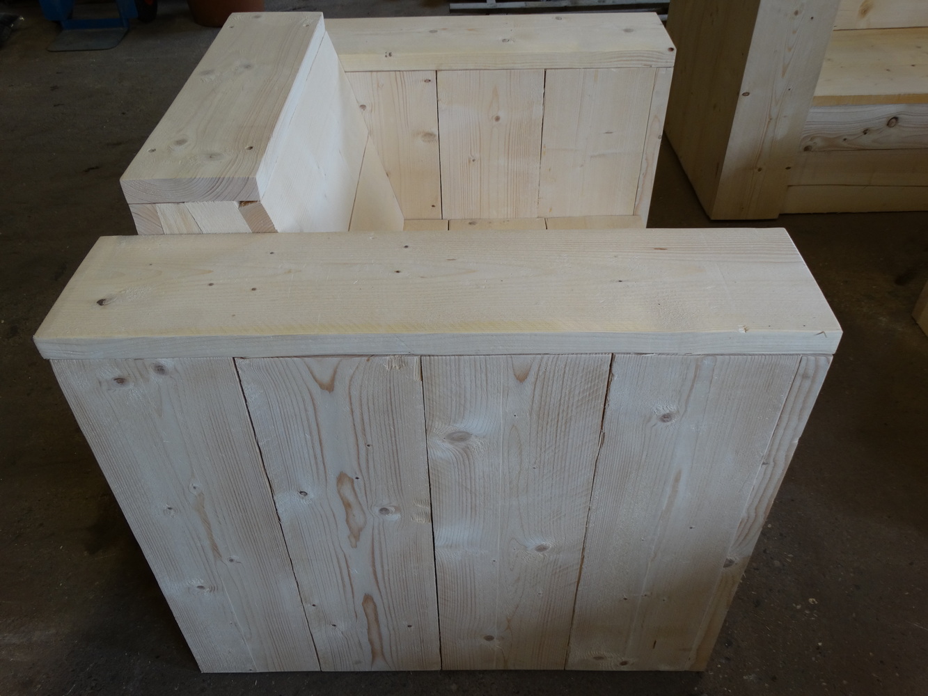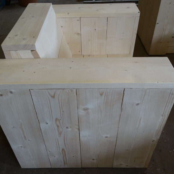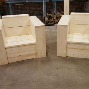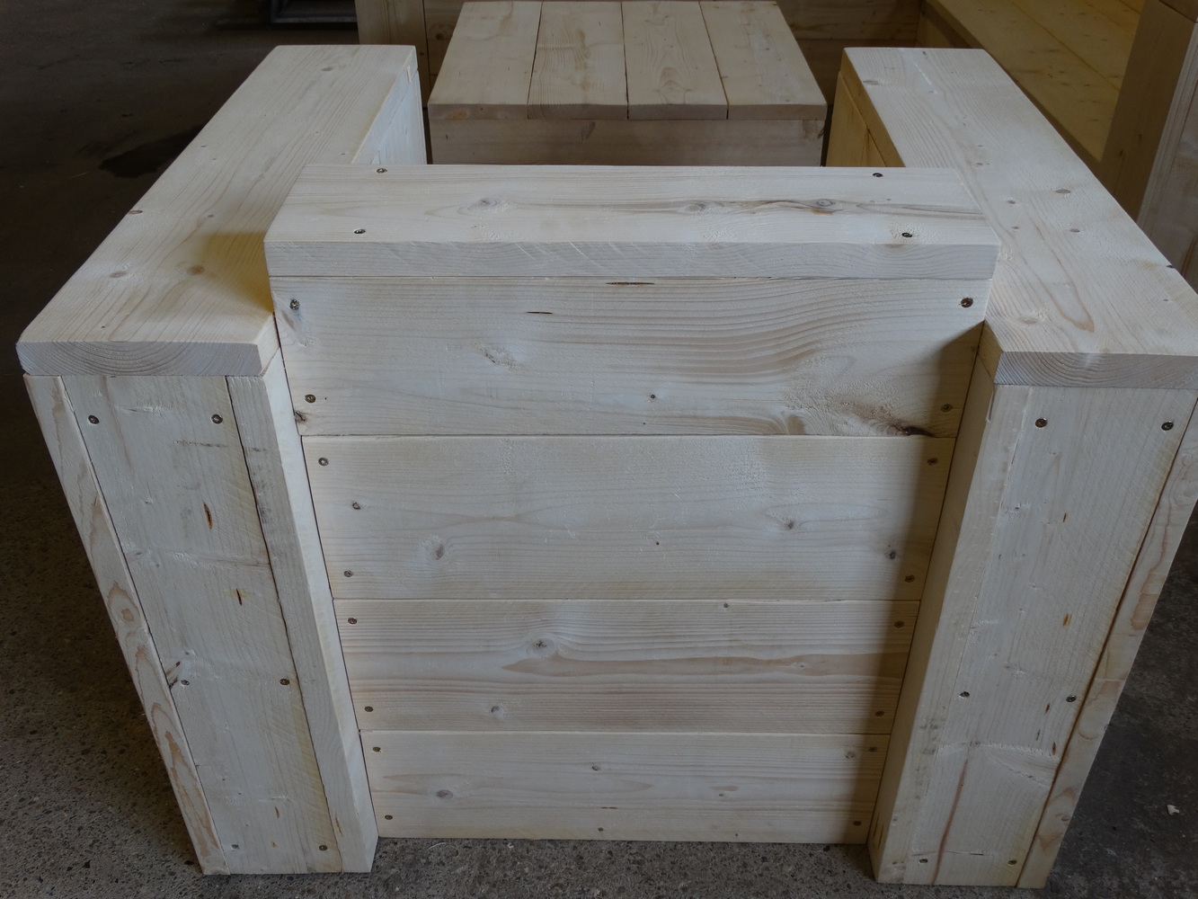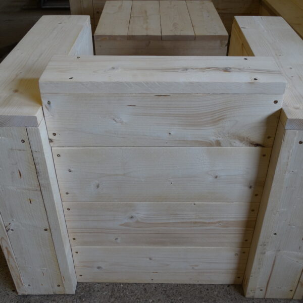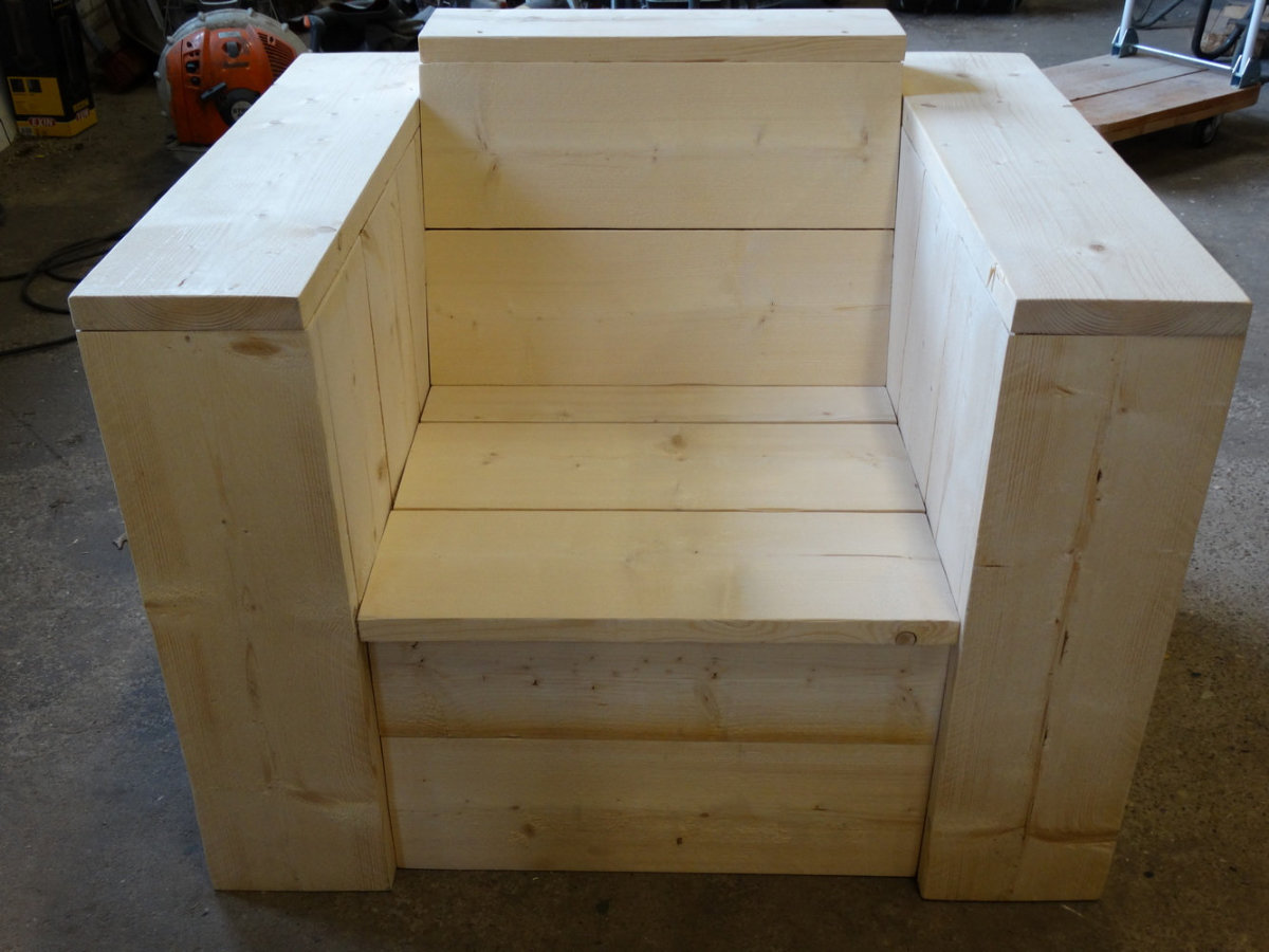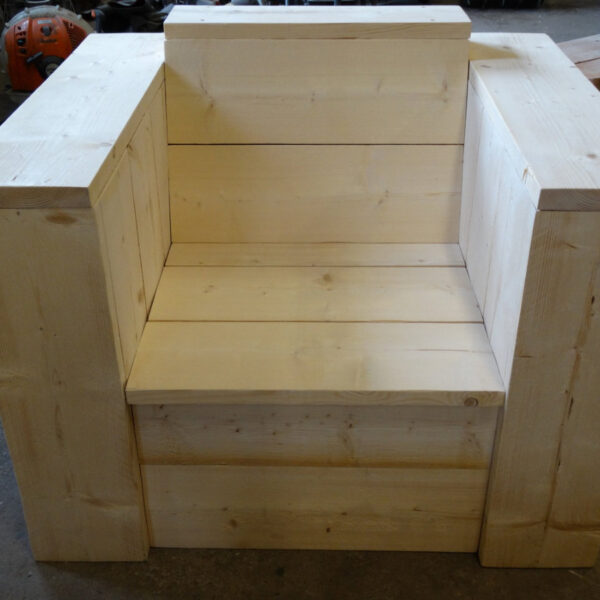 Lounge chair made of new scaffolding wood. Dimensions WxDxH: 100x85x80cm, seat size 50x50cm