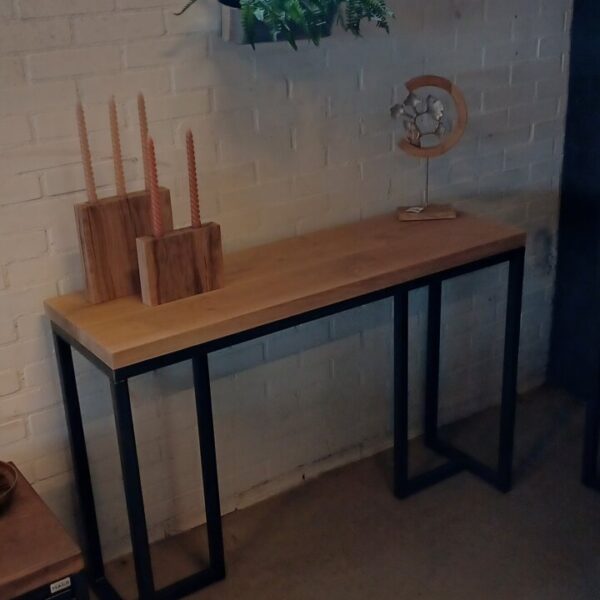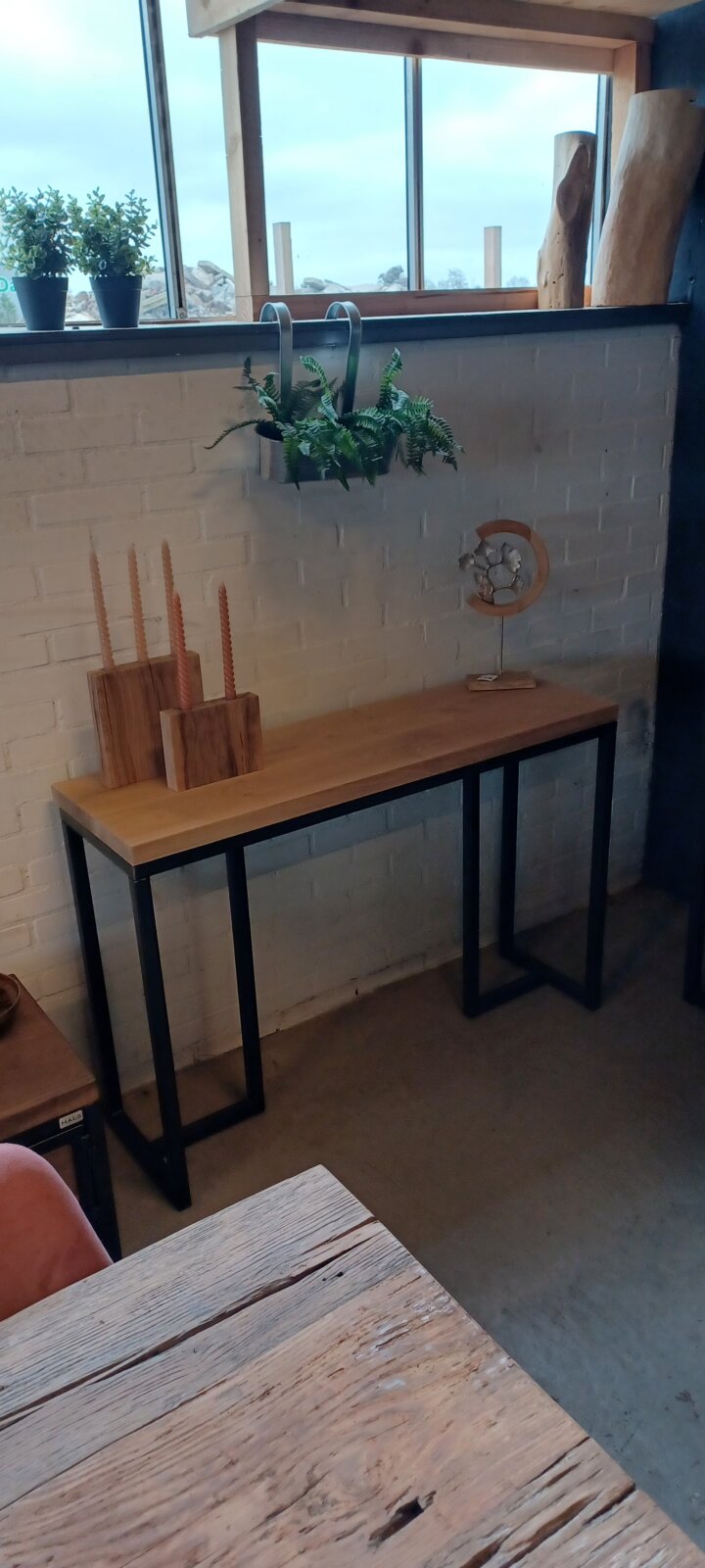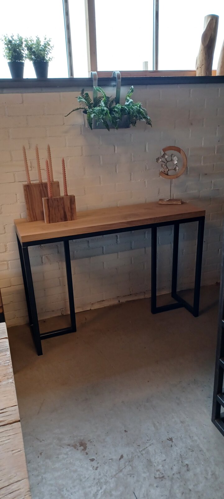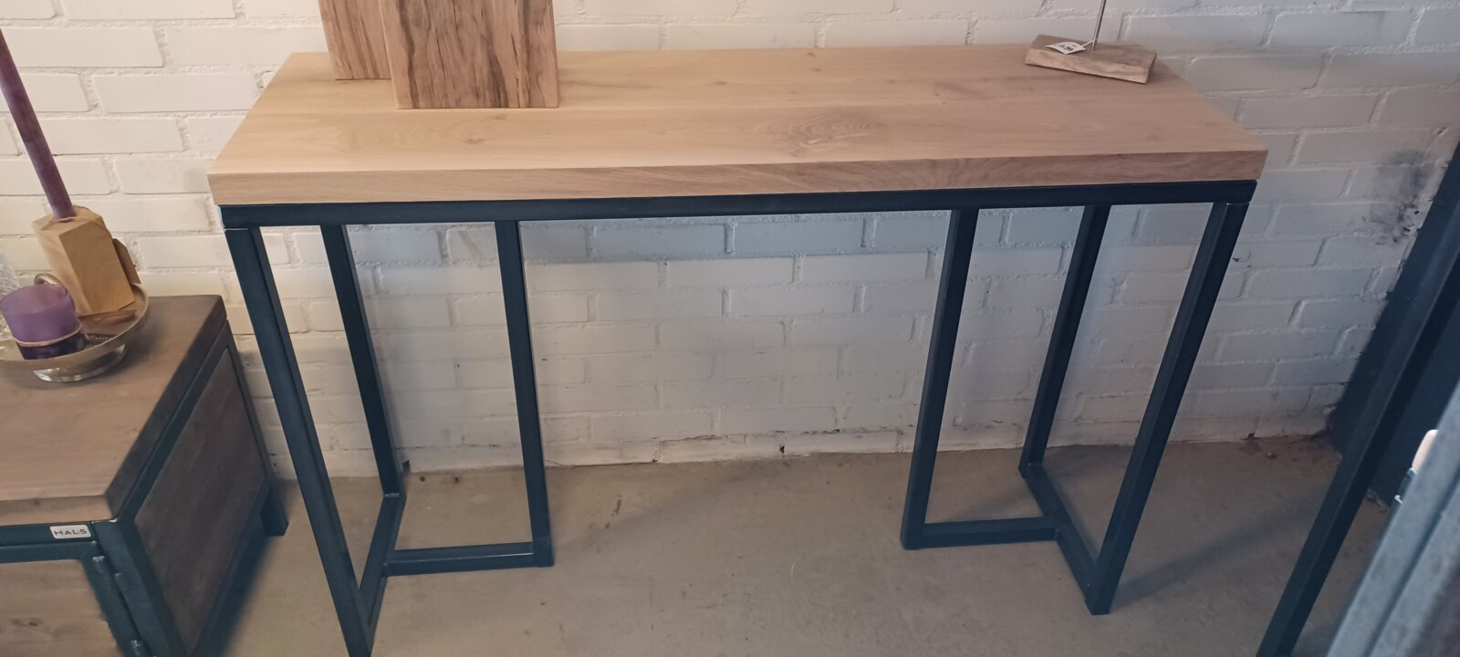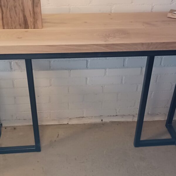 Sidetable 120×37,5x80cm (WxDxH) with oak top and 6 steel 3x3cm legs. The steel is coated transparantly for an industrial look. The oak top is 4cm thick and is a bit deeper than the steel, so a baseboard isn’t a problem to place the table against te wall. The wood is untreated, but ofcourse we can do this for you if you wish.