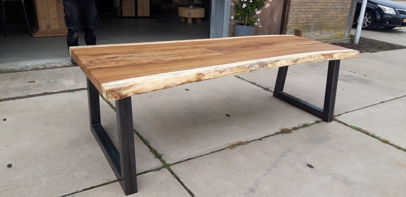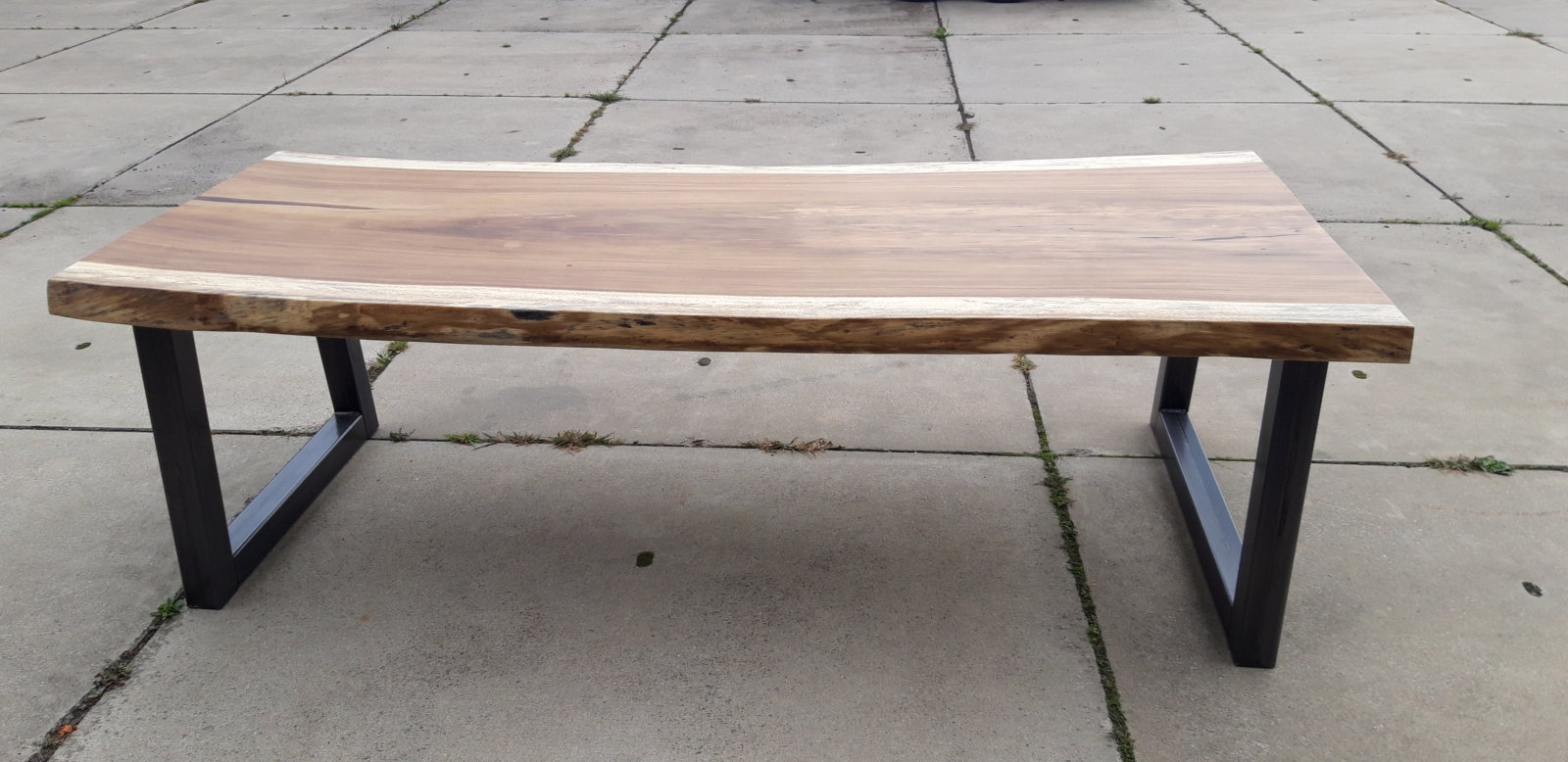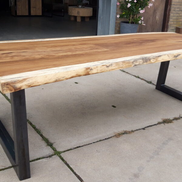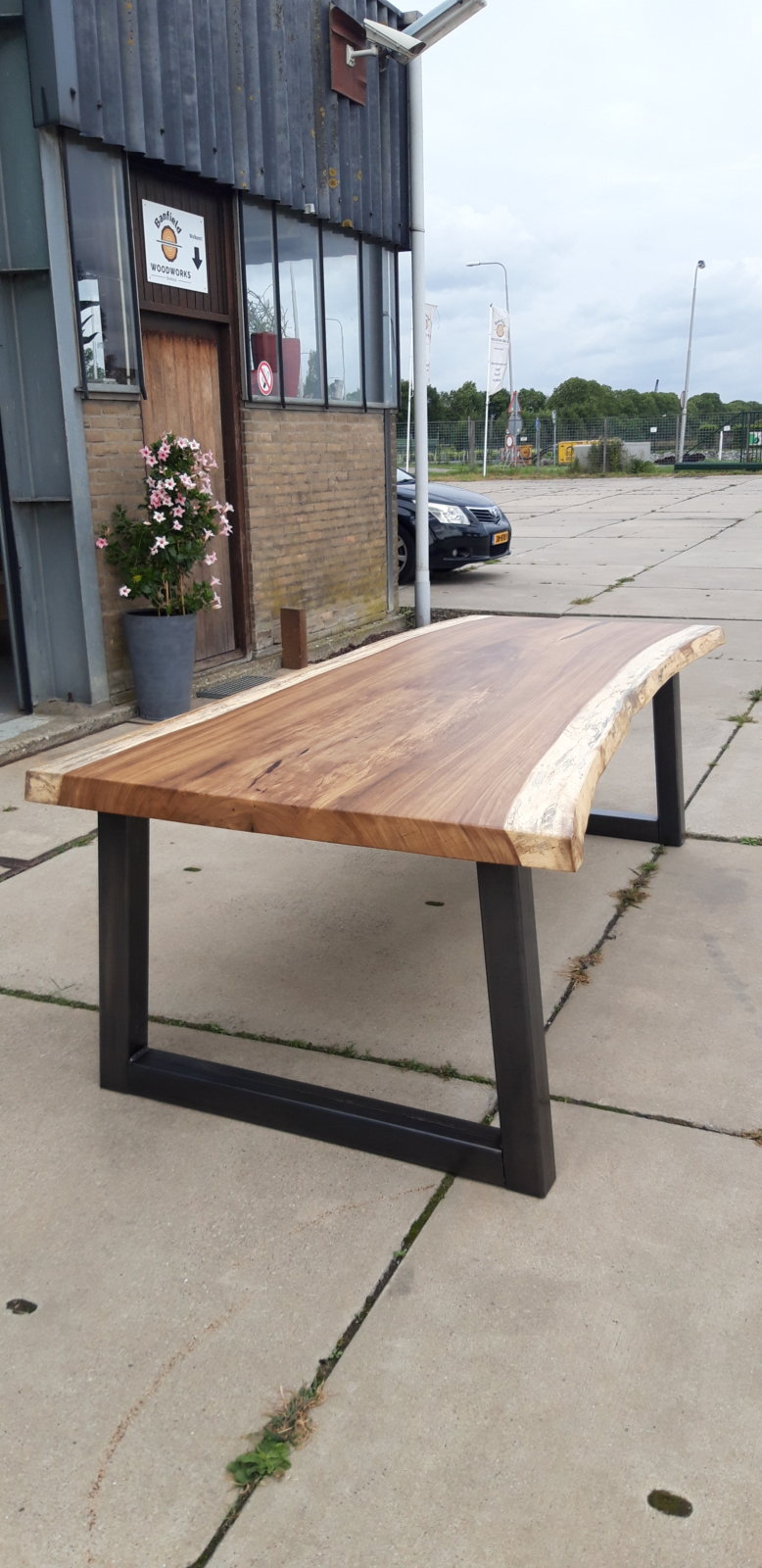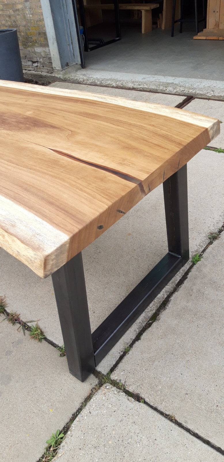 Solid live edge table Solid live edge table of 2,5 meters long with industrial trapezium base. Filled with epoxy and treated with a matte finish to protect the wood. Category: Furniture Tags: industrial, live edge, woodworks Related products Read more Wall unit Add to basket High table € 499,00 Read more Coat rack steel/oak Add to basket Children’s coat rack € 250,00