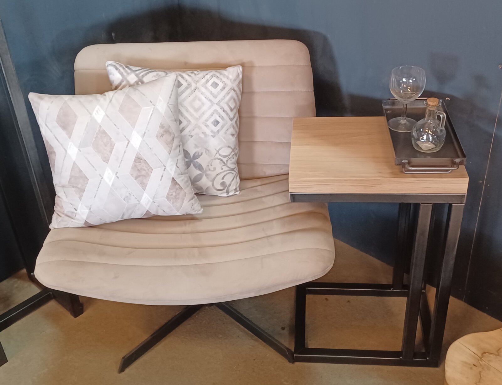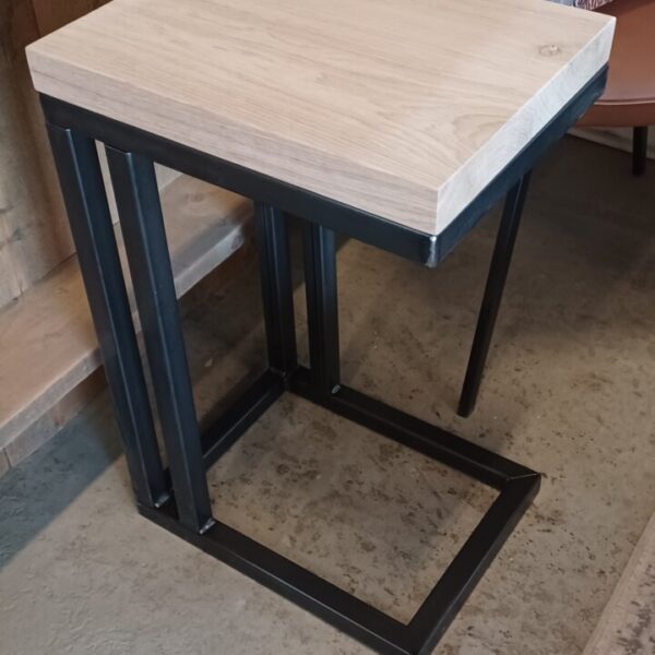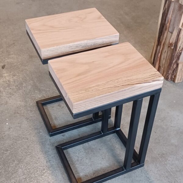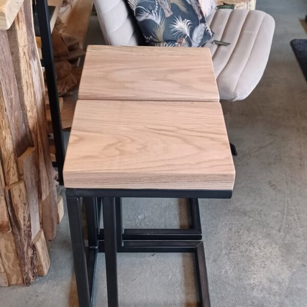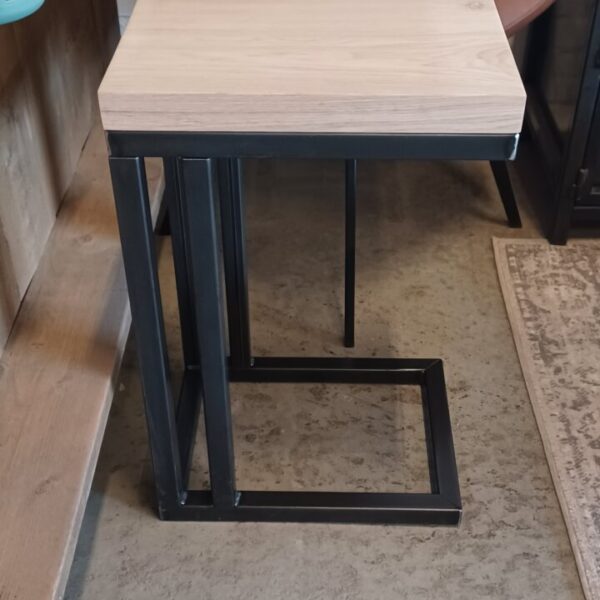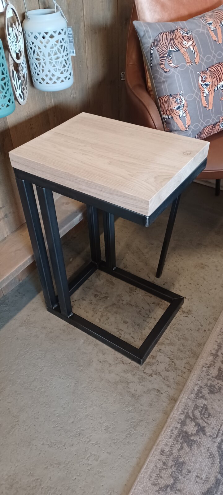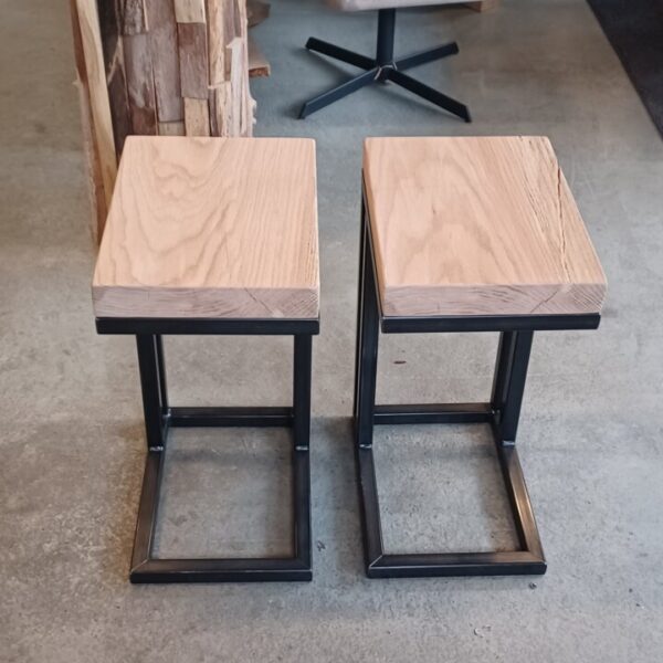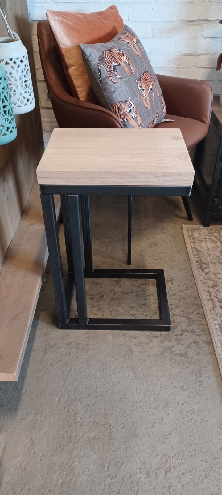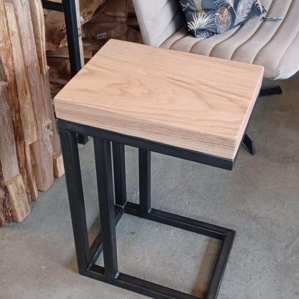 Bijzet banktafel van industrieel staal koker 3x3cm met een 4cm dik eiken blad. Afmetingen: 30x40x62cm (BxDxH). Het hout is behandeld met transparante lak.