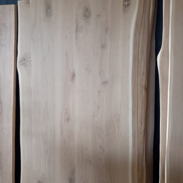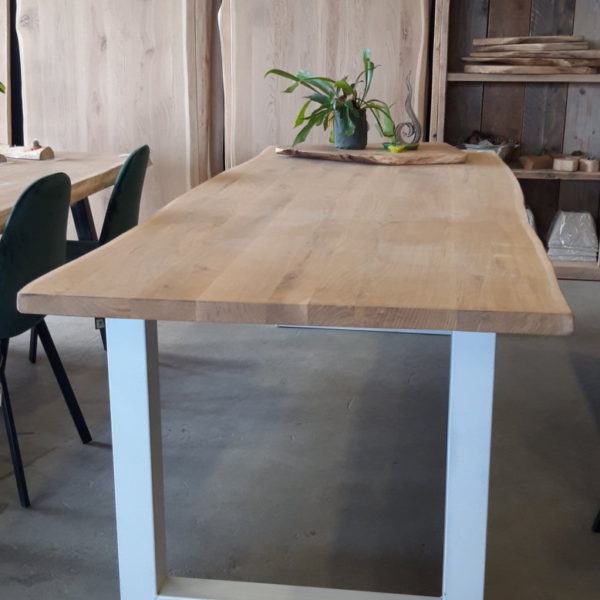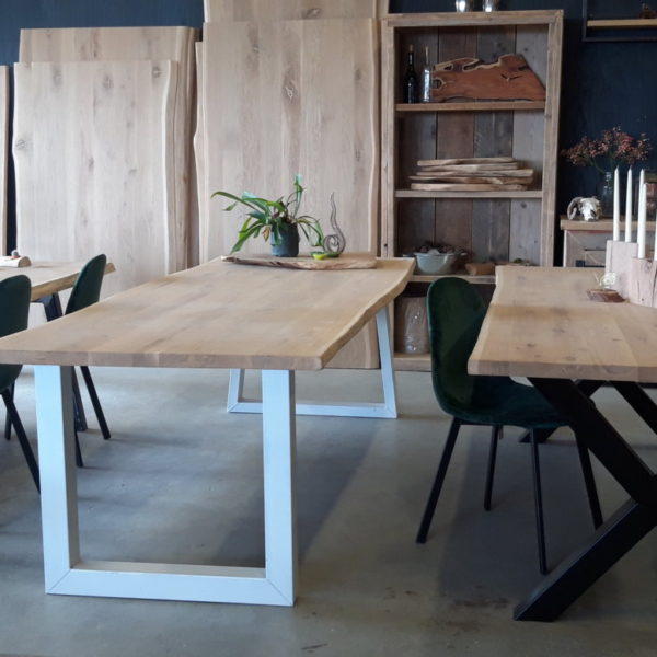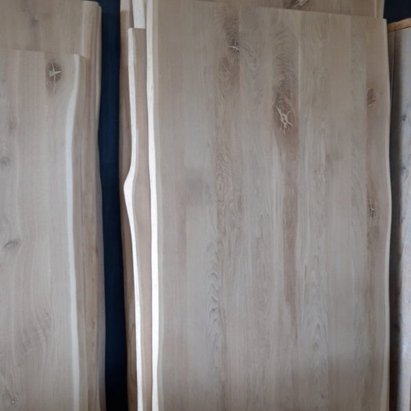 Eiken tafelbladen met boomstamrand afwerking. Ongeveer 100cm breed en 4cm dik. Per strekkende meter € 295,00 in lengtes van 180 t/m 300cm. Bladen vanaf 300cm lang kosten € 350,00 per strekkende meter. Houtbehandeling naar keuze tegen kringen etc. kunnen wij uiteraard verzorgen tegen meerprijs. Diverse onderstellen zijn mogelijk, zowel op maat gemaakt als de ‘standaard’ X-, U-, trapeziumpoten etc. Ook zijn houten op maat gemaakte poten/onderstellen mogelijk natuurlijk!
