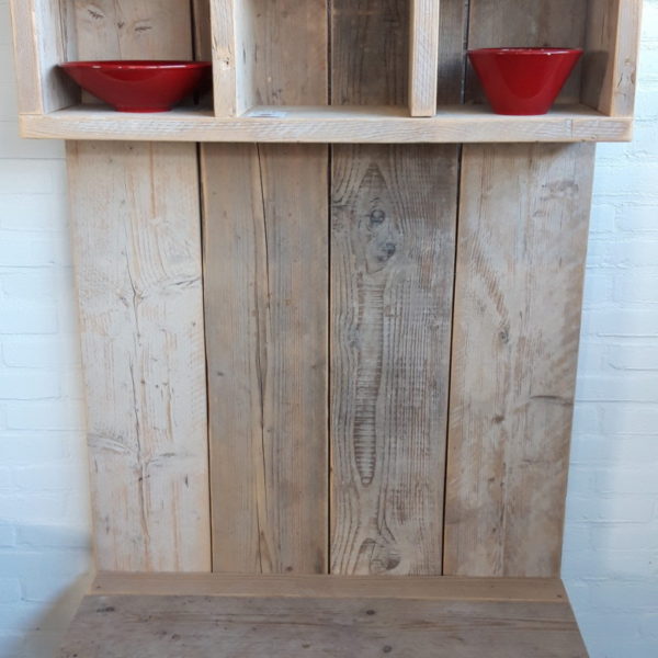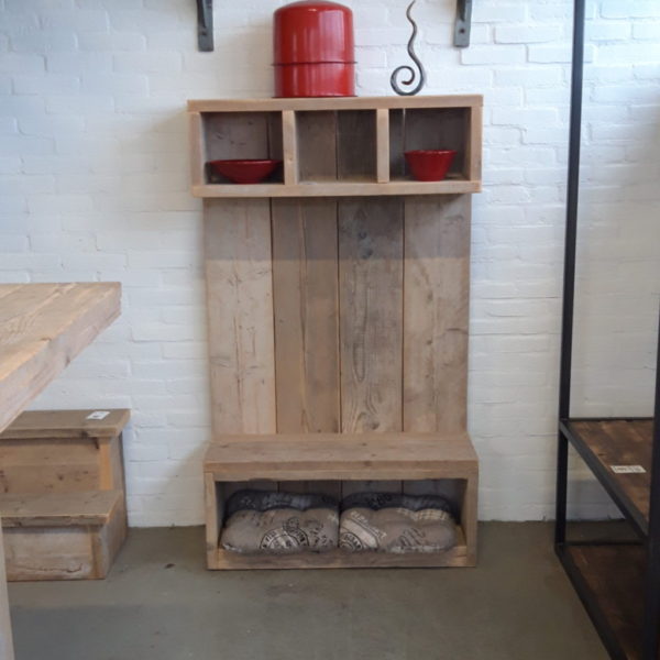 Kinderkapstok van gebruikt steigerhout met stalen ophanghaken. Afmetingen: 150x89cm (HxB)