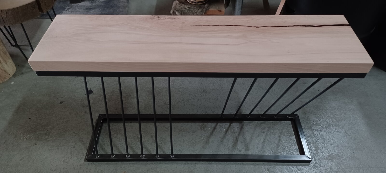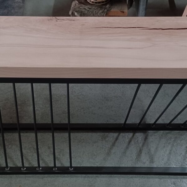 Sidetable met robuust eiken blad en bijzonder stalen onderstel. Afmeting: 120x30x73cm (BxDxH). Het blad is nog onbehandeld, uiteraard kunnen wij dit verzorgen met bijvoorbeeld hardwax of Skylt.