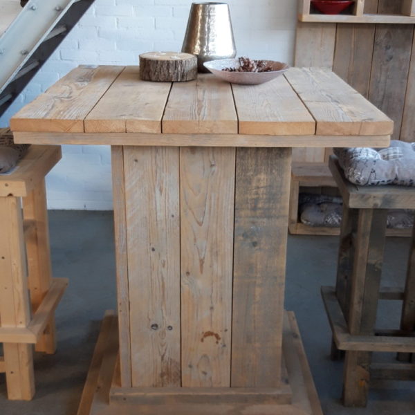 Statafel van gebruikt steigerhout. Afmetingen: 100x100cm, hoogte 110cm