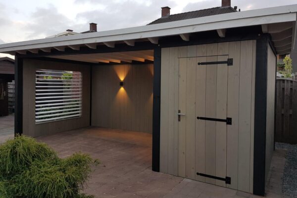 Een grote overkapping met schuurruimte mogen maken. De constructie en het verfwerk zijn op de werkplaats voorbereid, zodat op locatie het echte bouwen direct van start kon. De overkapping heeft een louvrescherm welke open en dicht kan, tevens zijn spotjes en wandlampen geplaatst.